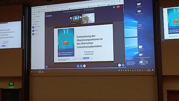 Das Hauptthema der Veranstaltung drehte sich um „die Entwicklung der Maschinenperfusion in der klinischen Lebertransplantation“. Dazu war Prof. Philipp Dutkowski, leitender Arzt Viszeralchirurgie, Clarunis Universitäres Bauchzentrum Basel, aus Basel per Video zugeschaltet. Er referierte über die bahnbrechende Entwicklung der Maschinenperfusion, an der er als Pionier maßgeblich beteiligt war.