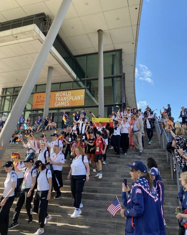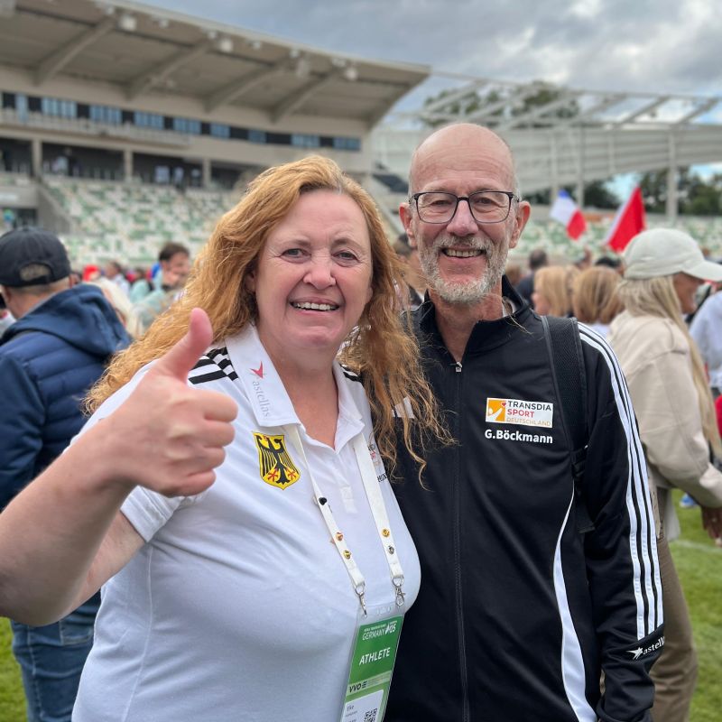 Bei der Abschlussfeier im „Heinz-Steyer-Stadion“ haben wir einen „Circle of life“ gemacht. 2.500 Transplantierte nahmen sich an der Hand und bildeten einen Kreis um das Stadium herum. Der Sänger Roland Kaiser (lungentransplantiert) und die Ehefrau unseres Bundespräsidenten Steinmeier (Spender) Frau Elke Büdenbender (nierentransplantiert) waren auch anwesend und haben uns motiviert und sich für Organspende ausgesprochen. Es war alles so bewegend. Danke, Danke, Danke, dass ich bei diesem unglaublichen Ereignis dabei sein durfte.