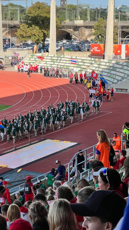 Danach ging es zu dem „Walk of nations“ - alle Länder gingen hintereinander in einer Parade durch die Innenstadt von Dresden, zur Eröffnungsfeier ins „Heinz-Steyer-Stadion“ Ich kann es gar nicht in Worte fassen, wie wir uns alle fühlten. Es war unglaublich ein Teil davon zu sein. Als am Schluss die Spenderfamilien in das Stadium einliefen, fingen viele an zu weinen, weil wir Dank ihnen und ihrer Entscheidung für die Organspende, leben dürfen. Alle standen auf und haben geklatscht.