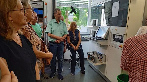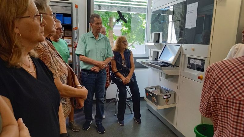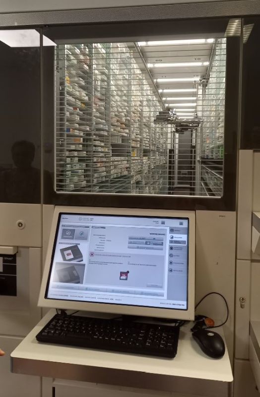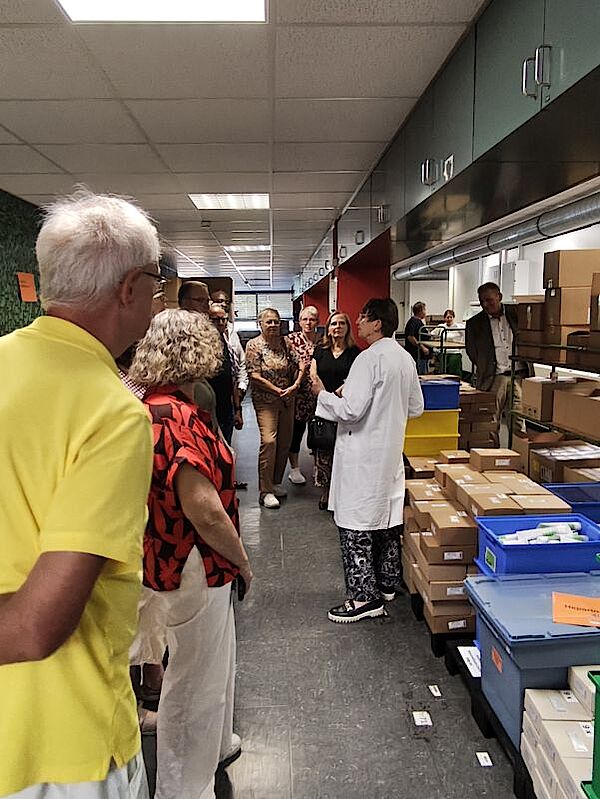 Im Anschluss gab es einen Rundgang durch die Apotheke und Frau Prof. Krämer informierte uns, zusammen mit einer Mitarbeiterin, über Bestellungen der Medikamente bis zur Auslieferung auf die Stationen. In der Apotheke gibt es auch zwei Roboteranlagen, die die Medikamente automatisch lagern und suchen, wenn Aufträge reinkommen. Die Teilnehmer stellten sehr viele Fragen, die Frau Prof. Krämer und ihre Mitarbeiterin beantworteten.